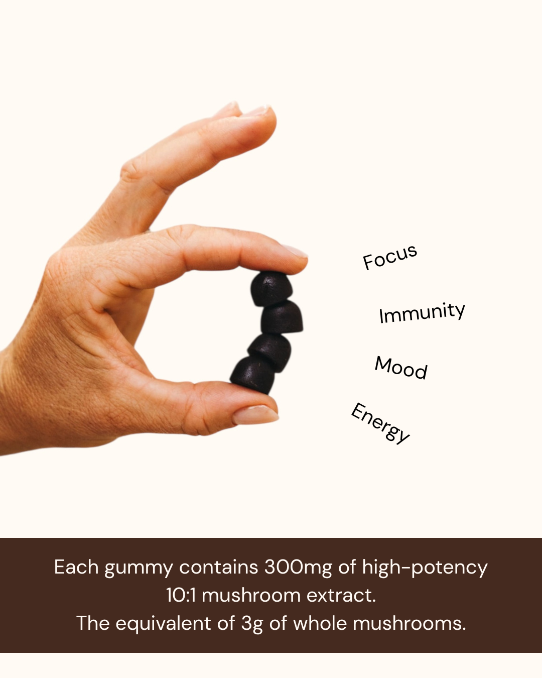 A potent blend that combines the top most valuable and sought-after medicinal mushrooms in an easy to consume delicious gummy.