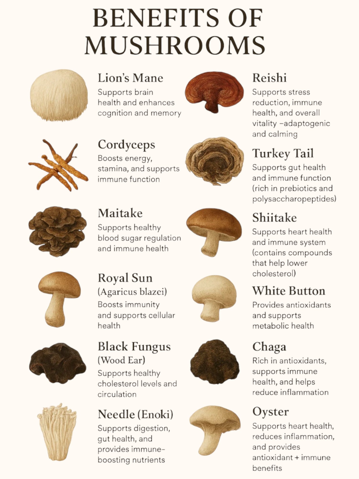 Our blend includes Lion’s Mane, Reishi, Cordyceps, Chaga, Turkey Tail, Maitake, Shiitake, White Button, Black Fungus, Royal Sun, Needle, and Oyster mushrooms.